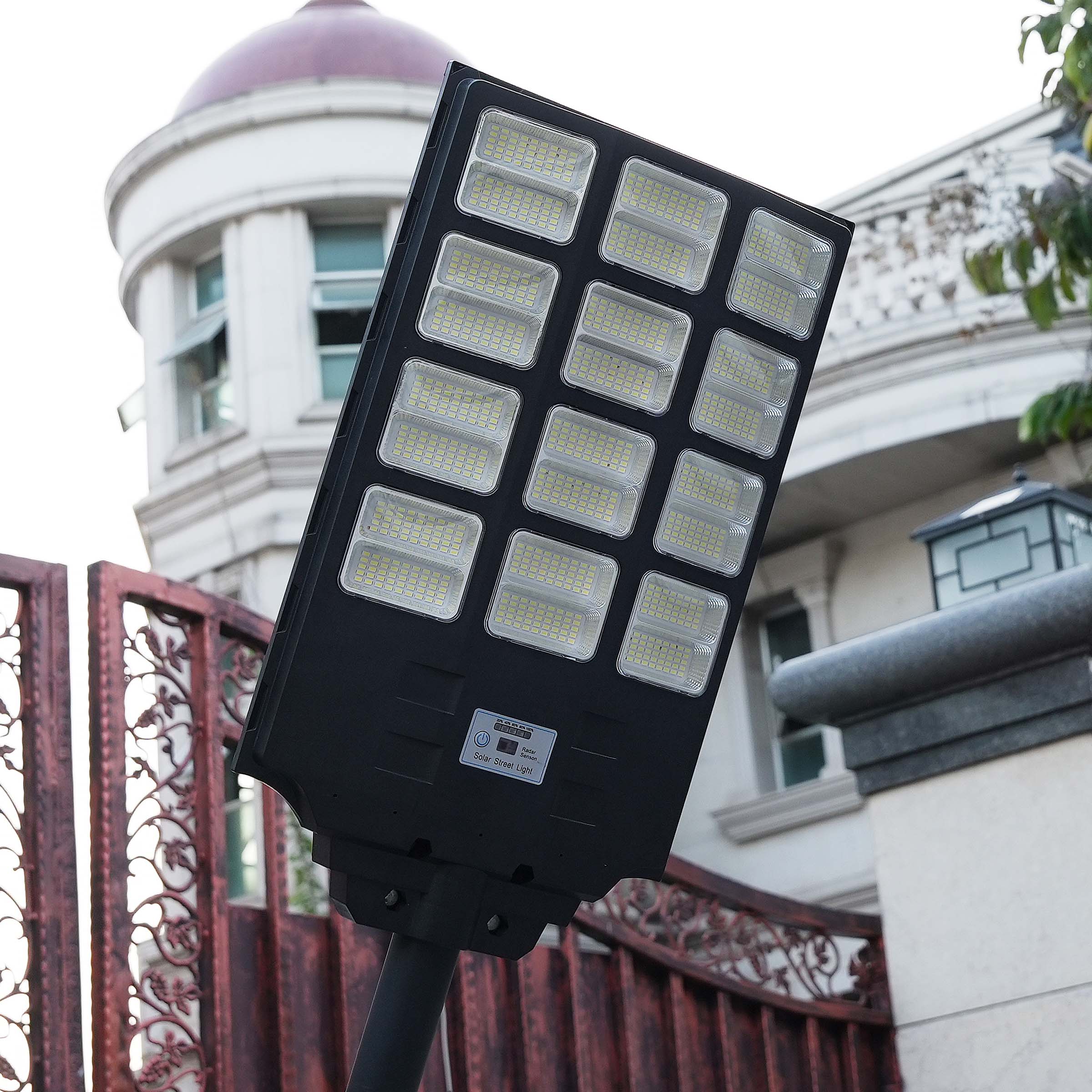 this is a commercial size solar light with a separate solar panel that connects to the mounting bracket but you can adjust the panel to get some better sunlight. I love that I only pay for this lighting once then the sun provides the light at night. It is very bright and the motion sensor is spot on. I would recommend this light .